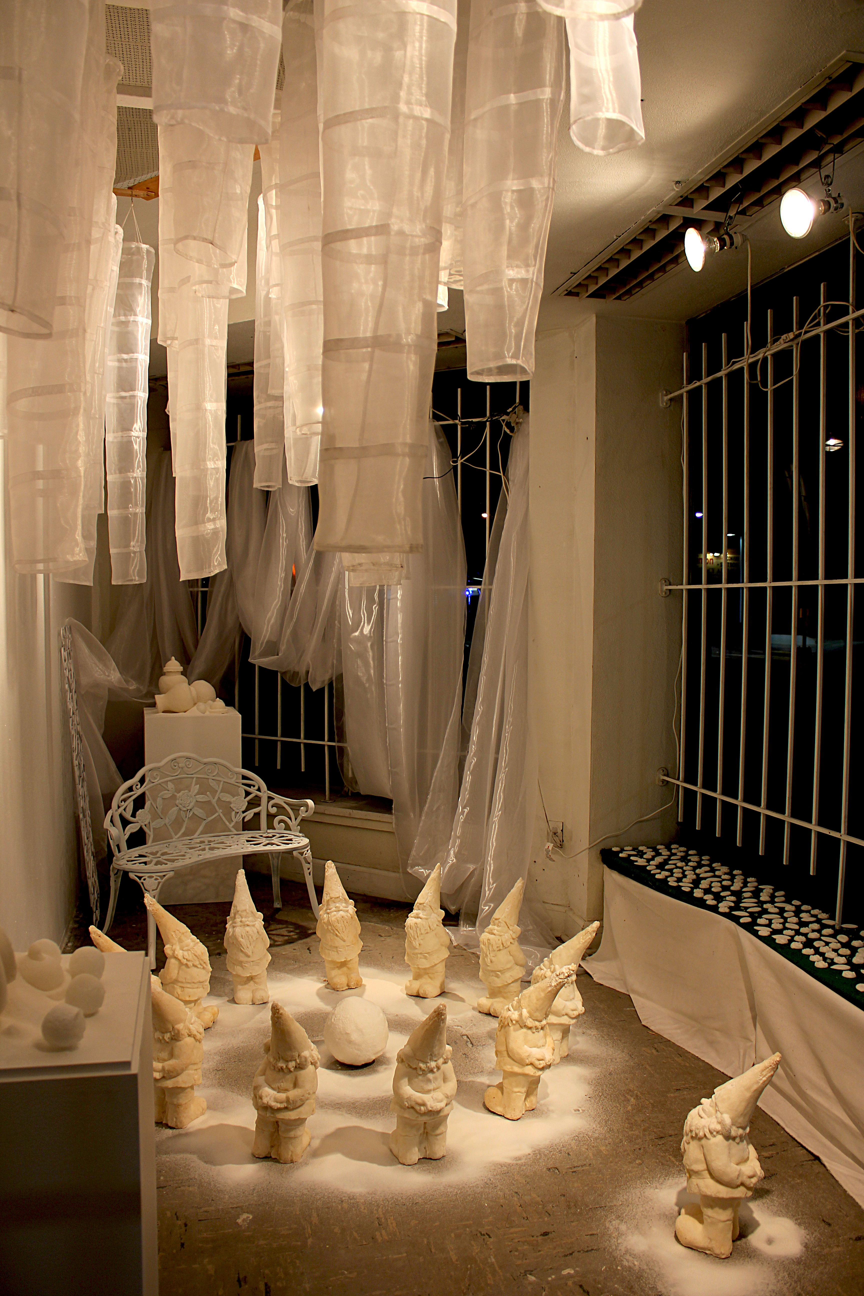 In 2015 I submitted a proposal to Box 13 Artspace in Houston to do an installation in their little window box gallery. It would be called Snow Garden and feature the cast sugar pieces I had been working on. They accepted my proposal, with the one requirement that I have an exterminator come in and spray before and after the show, as they’d had some pest problems in the past and wanted to be sure having a couple of hundred pounds of sugar lying around for a month didn’t revive the problem. I thought that was more than reasonable and agreed. Installation work is so much fun. You basically show up with a truck full of the pieces you’ve submitted and anything else you’re going to need and spend a couple of days just playing in the space. The volunteers working at Box 13 were wonderful and the whole thing was a great experience. We went back for the opening reception and everyone was so friendly. I remember it as one of those charmed evenings sitting around drinking wine and chatting about art with other people who love it as much as you do.
