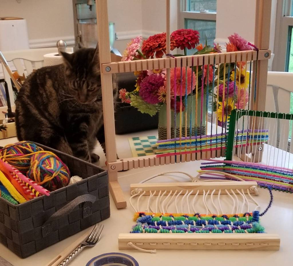 For children as young as Finn (4-years-old), there’s no need to get too concerned about getting the stems over and under EVERY warp thread. If they have the chance to play with the materials and be introduced to the idea of weaving the material over and under, that’s enough for now.
