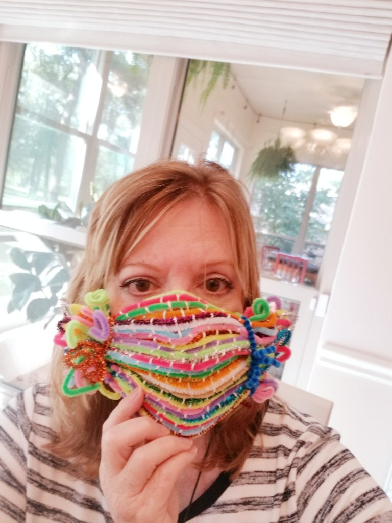 One cool thing about weaving with these materials is that the wire in the chenille stems means the piece can can be molded to hold a shape. Here is a mask I made using them on a potholder loom with string for the warp threads. This mask is just decorative, not functional, since there are large gaps and you can’t launder it.