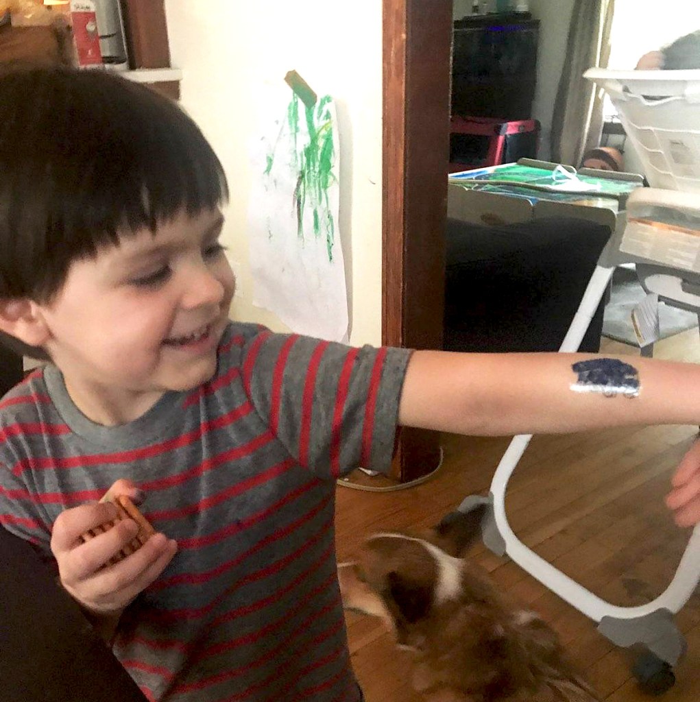 Predictably, Finn loved this project and made tattoos not only for himself, but also for his mom and dad. My daughter told me that his coloring on the tattoos was the best he has done at staying inside the lines – something that is difficult for a 4-year-old. During the call, he told me he wants me to come to his house for 20 days. Those of you reading this now, in August of 2020, know we are still battered by the pandemic, and I can’t. I like to think of happier days ahead when grandmas can hop on a plane and go visit grandsons for 20 days, but in the meantime, these weekly Art With Grandma sessions are a big bright spot for this grandma’s heart.