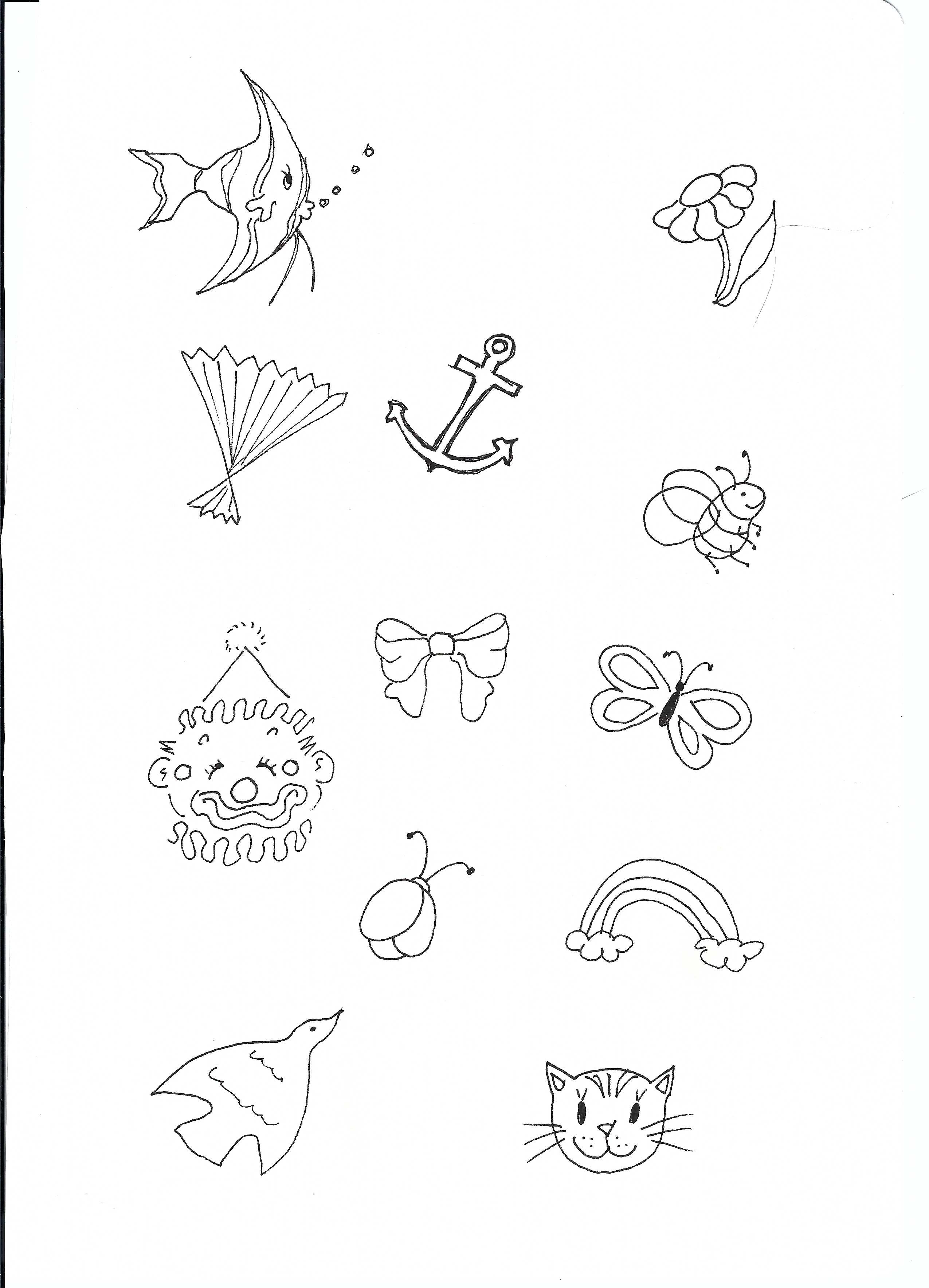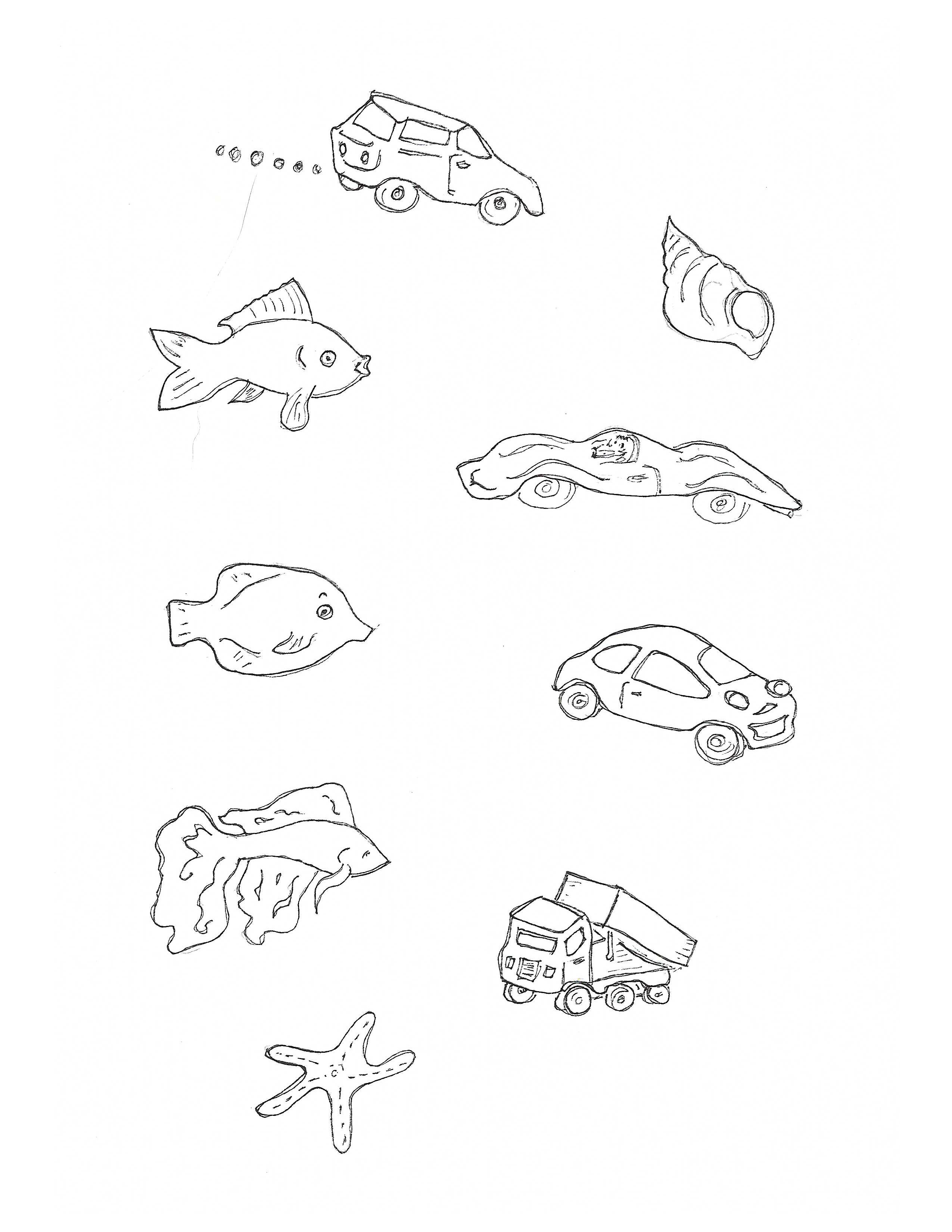 - I’m attaching two sheets of drawings you can use if you like. I originally drew just the first sheet and then a request came back from Finn for race-cars and fish : )