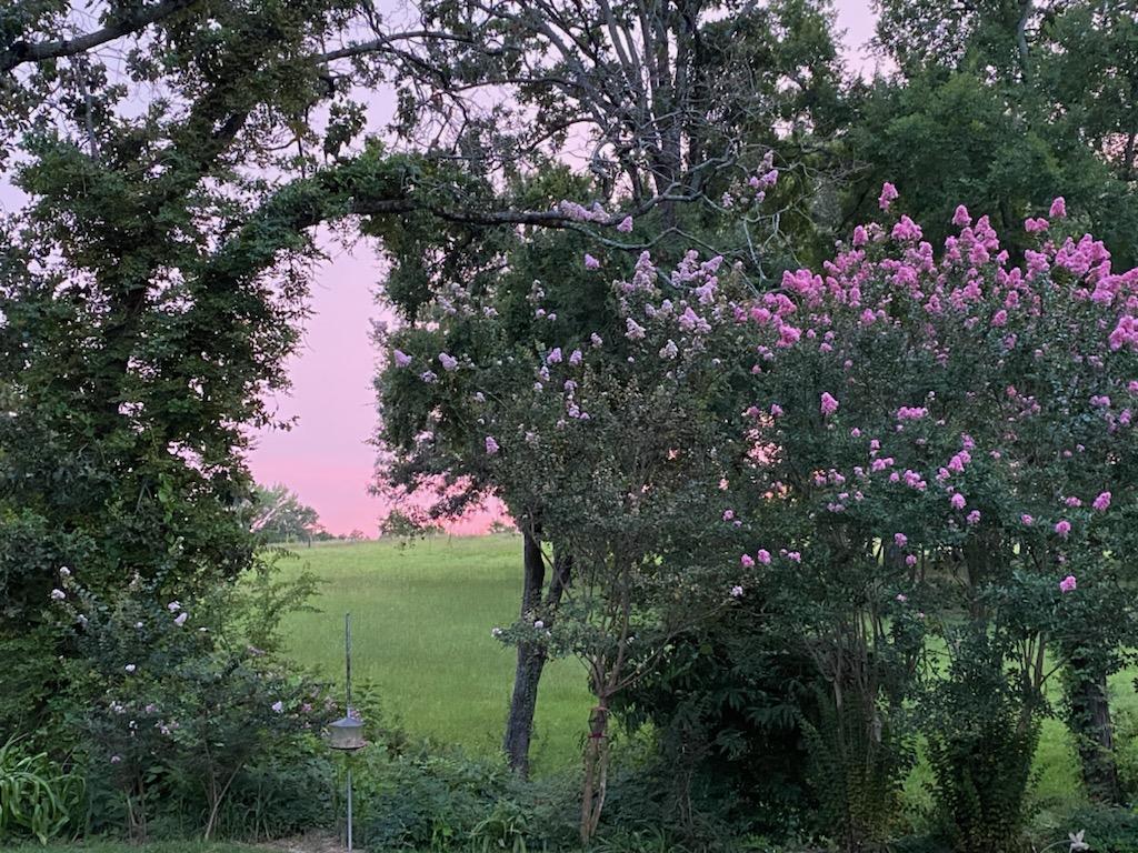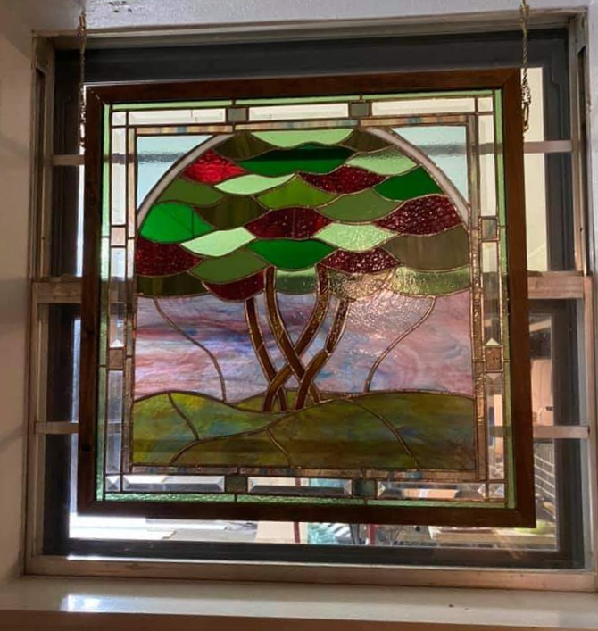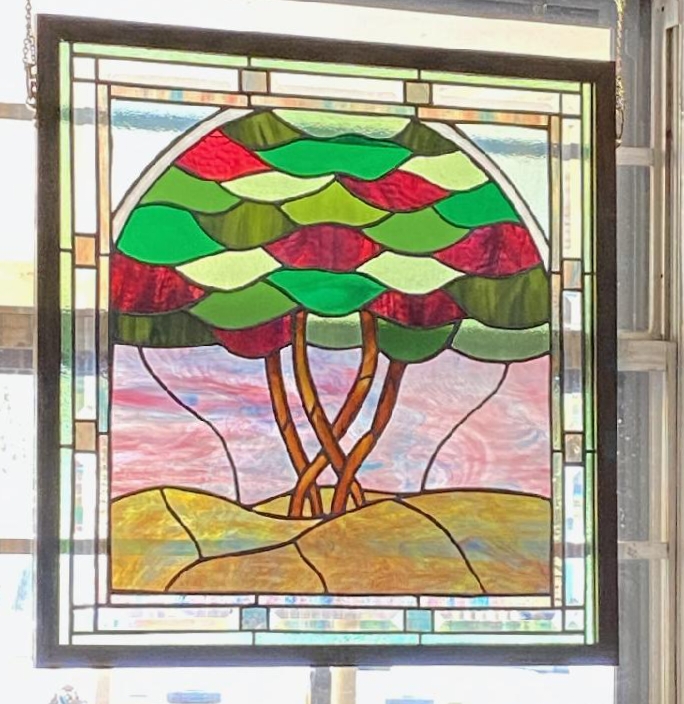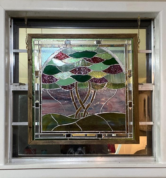My sister asked me to make two stained glass windows for her kitchen windows in East Texas. She was interested in a somewhat traditional style and asked for colors and design that reflected her garden, particularly her beautiful crepe myrtle trees. Collaborating with her on the design turned out to be a lot of fun! I researched the concept of the Tree of Life as an artistic motif and was intrigued by the idea of adapting it for this purpose, with the multiple slender trunks of the crepe myrtle instead of the usual single bole. Traditionally, the Tree of Life represents the connection between Heaven and Earth, which seems an appropriate imagery to use in someone’s beloved home. I’m including two inspiration photos below that my sister sent me.