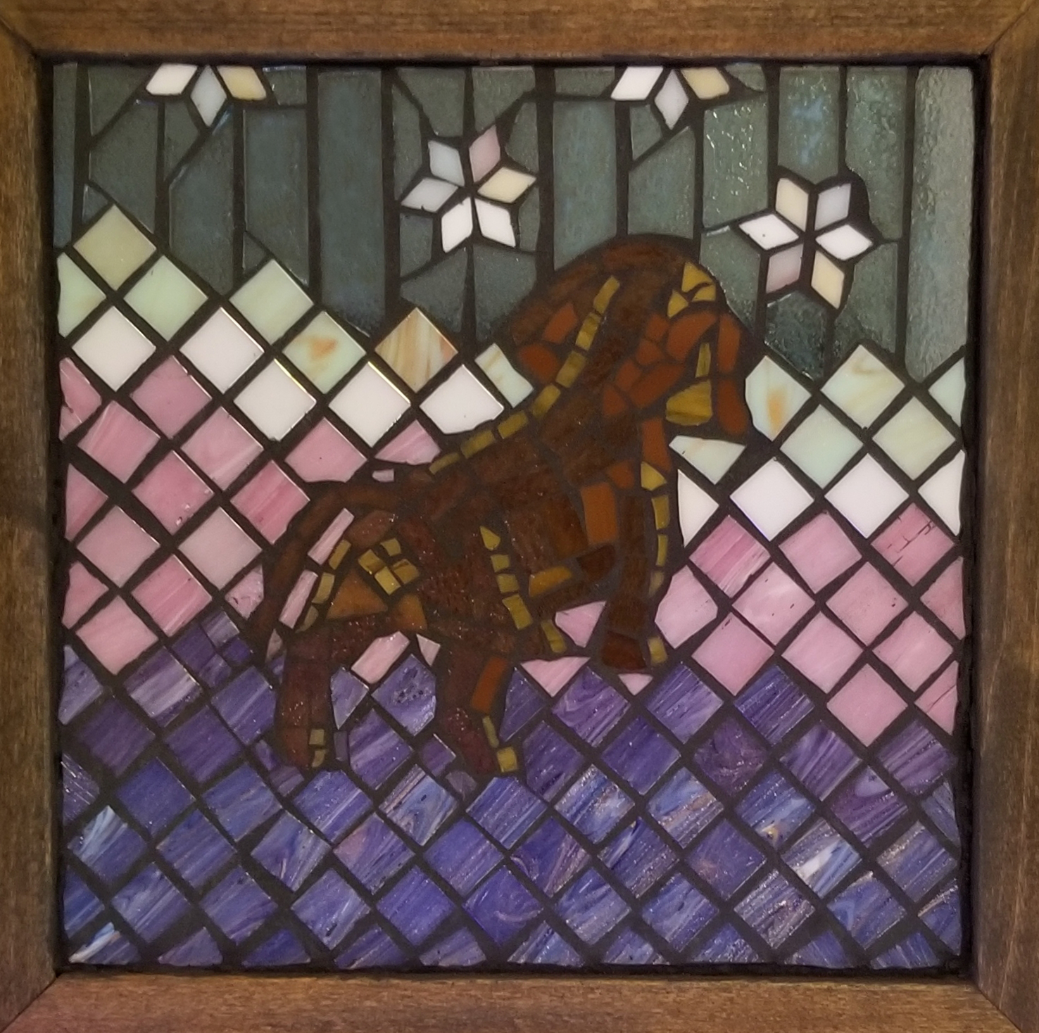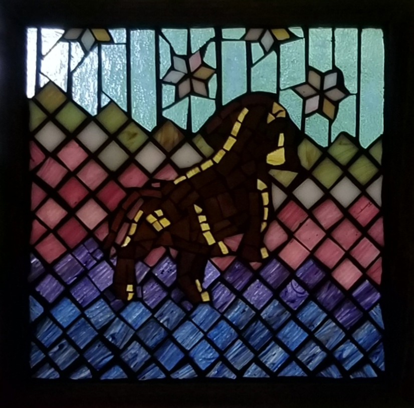 I took the photograph below of our dachshund puppy, Cocoa Puff, at eight weeks of age as she ventured out onto the sunporch for the first time. I was struck by how her posture and the accidental composition of the photo made it look as if a whole world was opening out in front of her. I decided to try and interpret this photo in glass-on-glass mosaic, a fairly new medium for me, and you see the result above. I’m also including a photograph of the piece taken at night, as the colors and detail show better when it is not backlit.