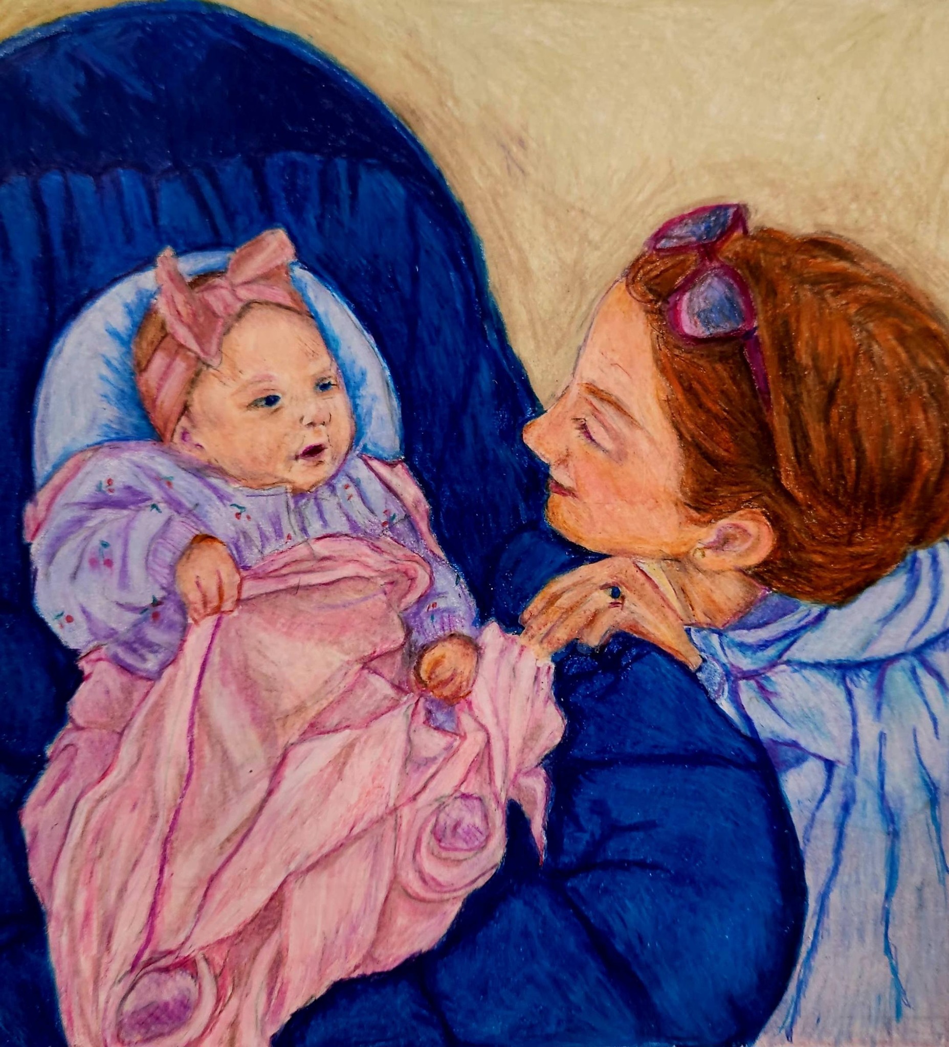 Mother and Child, Maine 2025, colored pencil on paper, 8″ x 7.5″, 2025